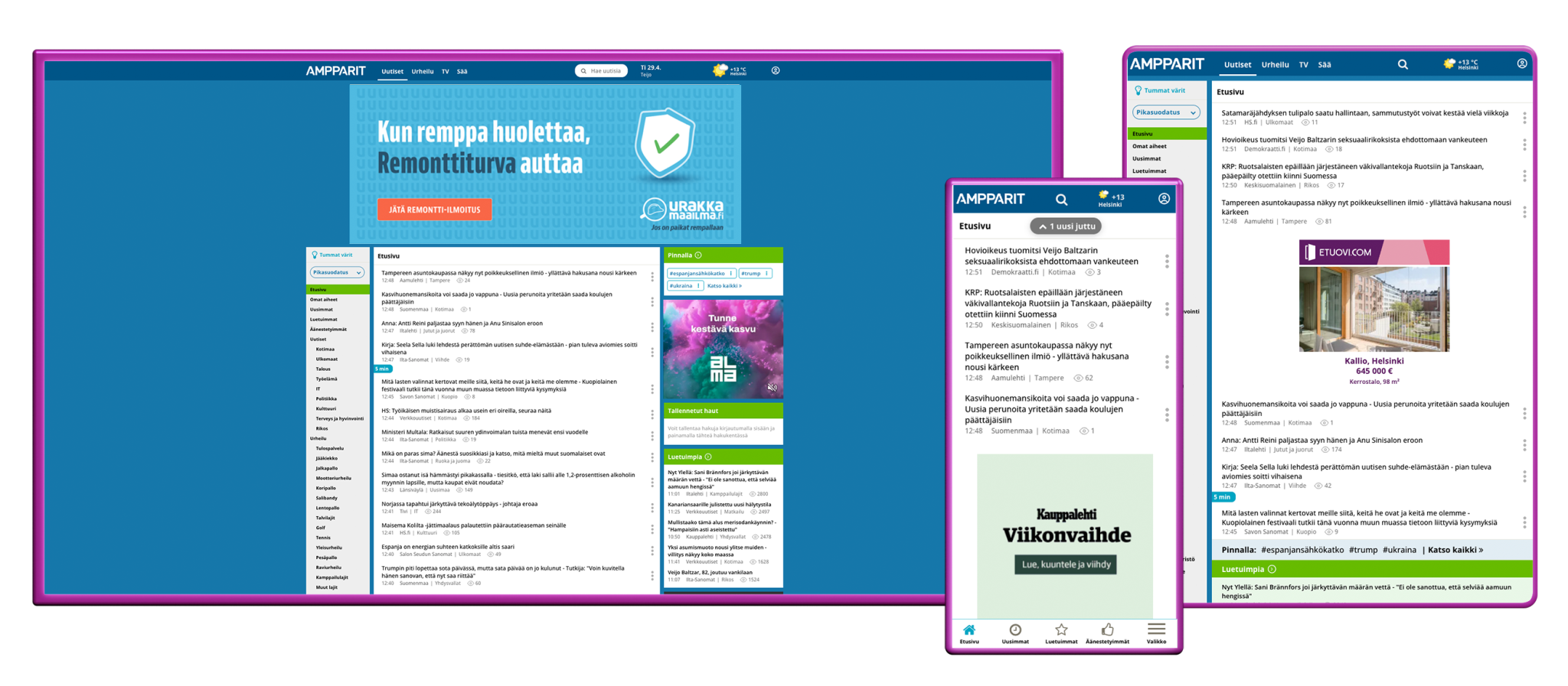 The most popular content includes domestic news, finance, IT, entertainment, and sports—especially ice hockey, ball sports, motorsports, and major sporting events, which significantly boost visitor numbers on the service. Sporting events also immediately drive second screen usage during program breaks. In addition to news, Ampparit offers weather forecasts for over 1,000 locations worldwide and TV listings for more than 50 channels.